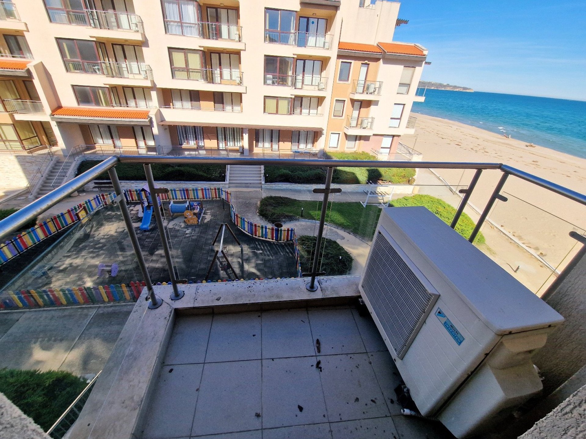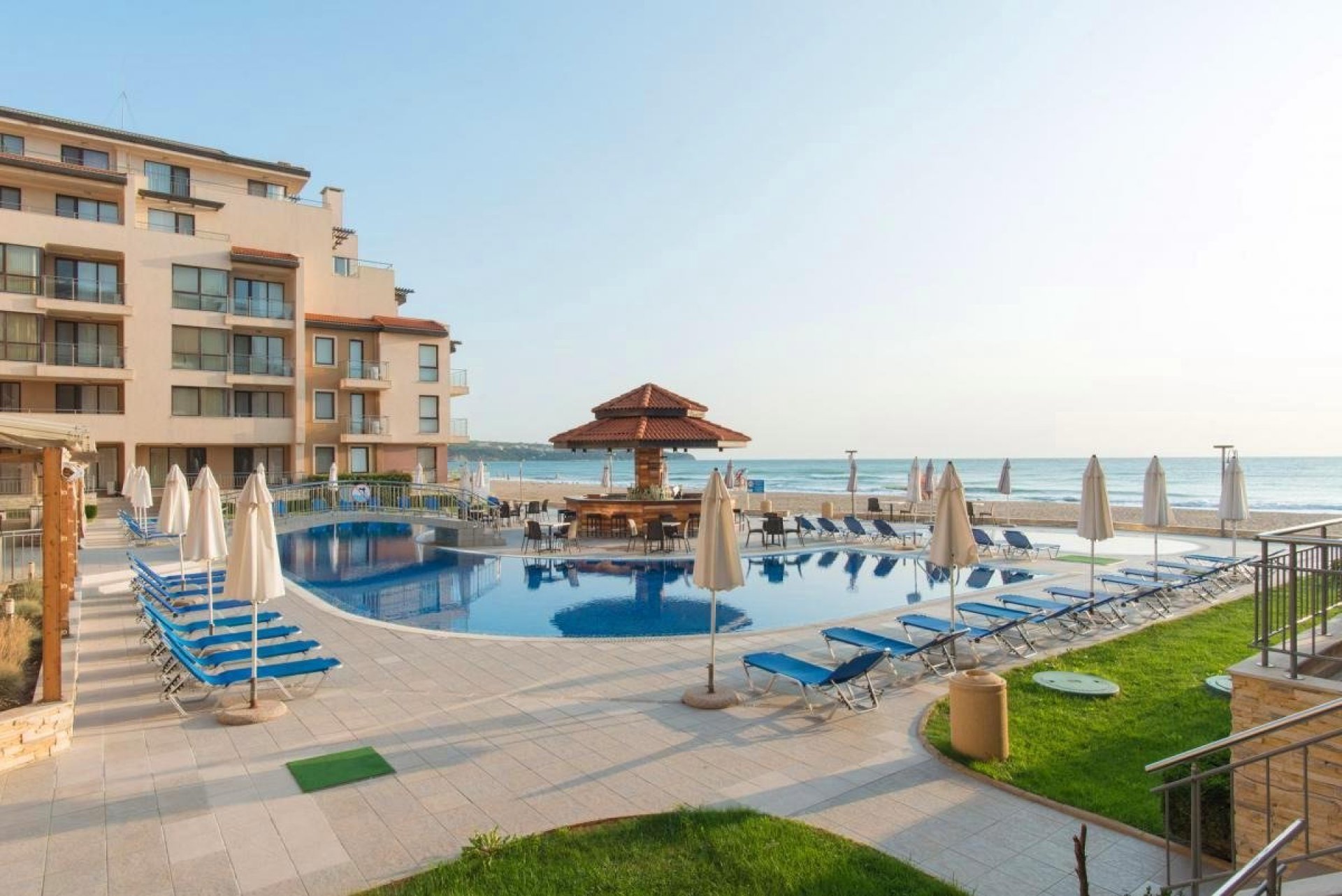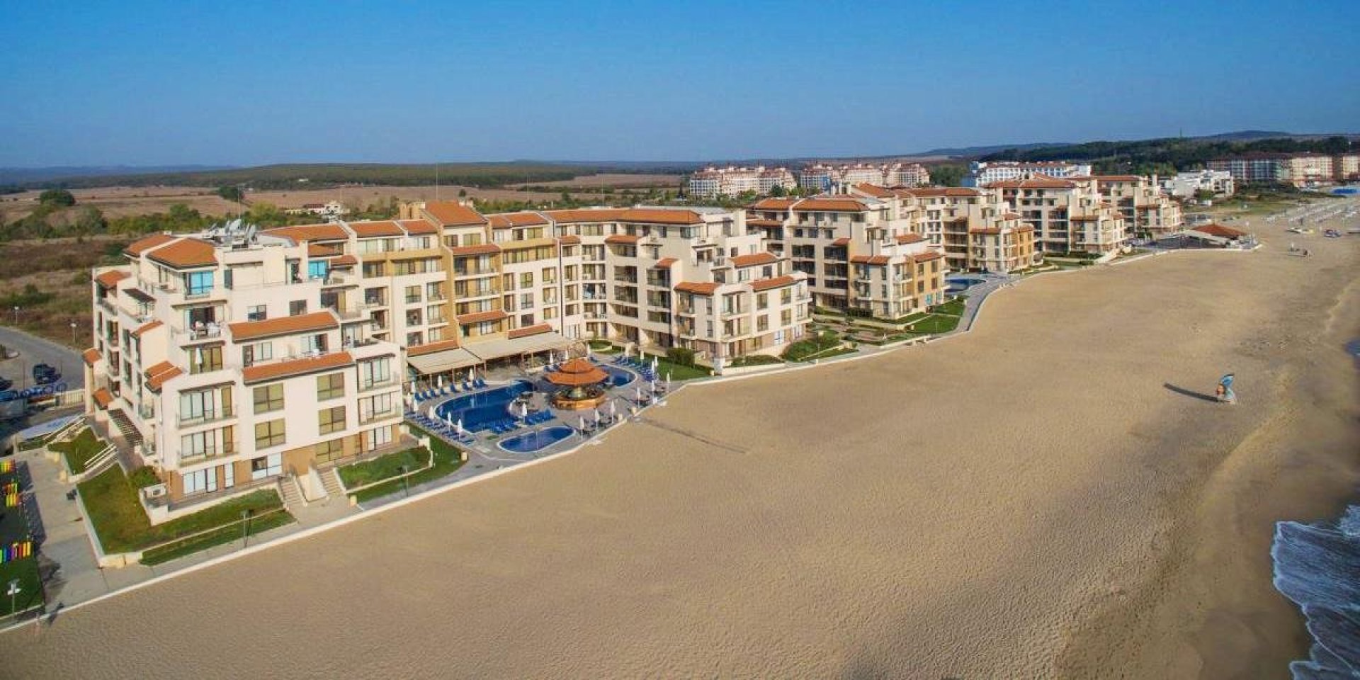 The complex by the beach offers a wide range of facilities for relaxation and active days. Swimming pools with sun loungers and parasols, fitness, restaurant, children's playground, animation, reception, guarded parking and year-round security. Right in front of the house is one of the most beautiful beaches in Bulgaria - 10 kilometers long, with golden sand and calm sea.
