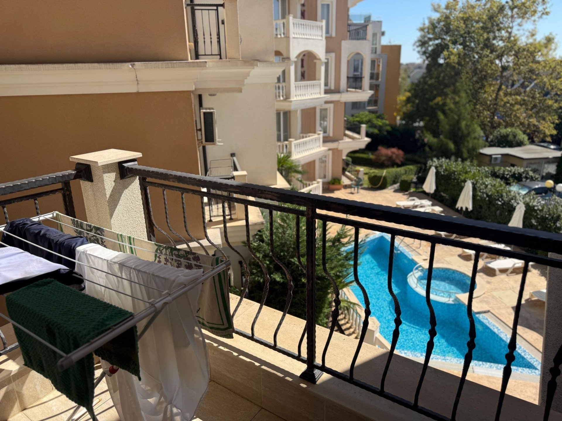 2 balconies overlooking the sea and pool