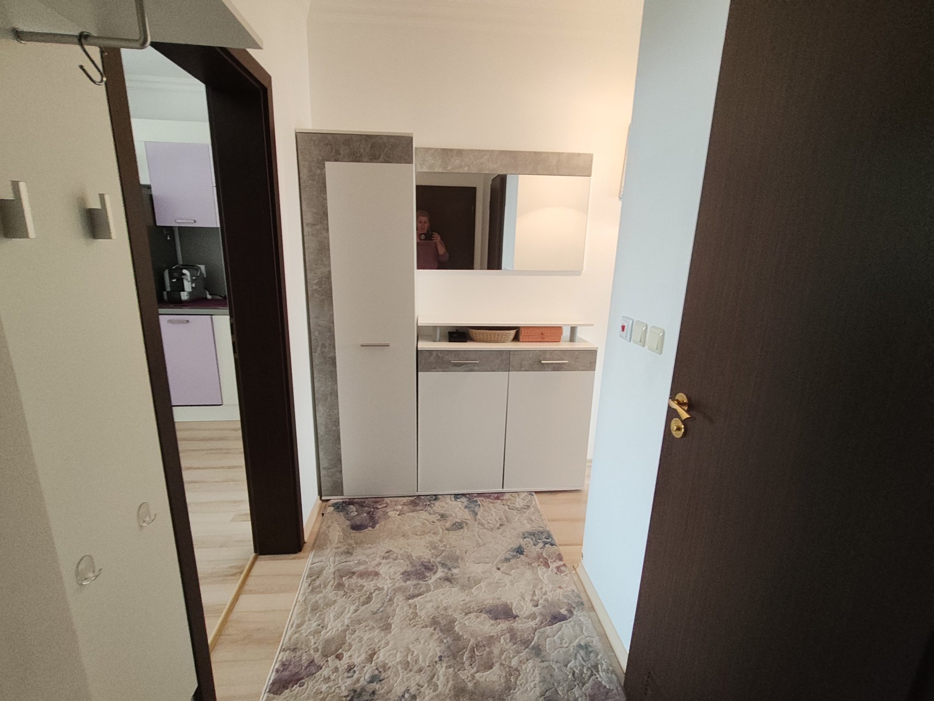 The bedroom is cozy and functional - a double bed, a large wardrobe and a pleasant atmosphere for a full rest. The bathroom is modern, with a shower, washing machine and boiler - all household amenities are provided. The entrance hall offers plenty of storage space and the lift makes it easy to access the high floor apartment.